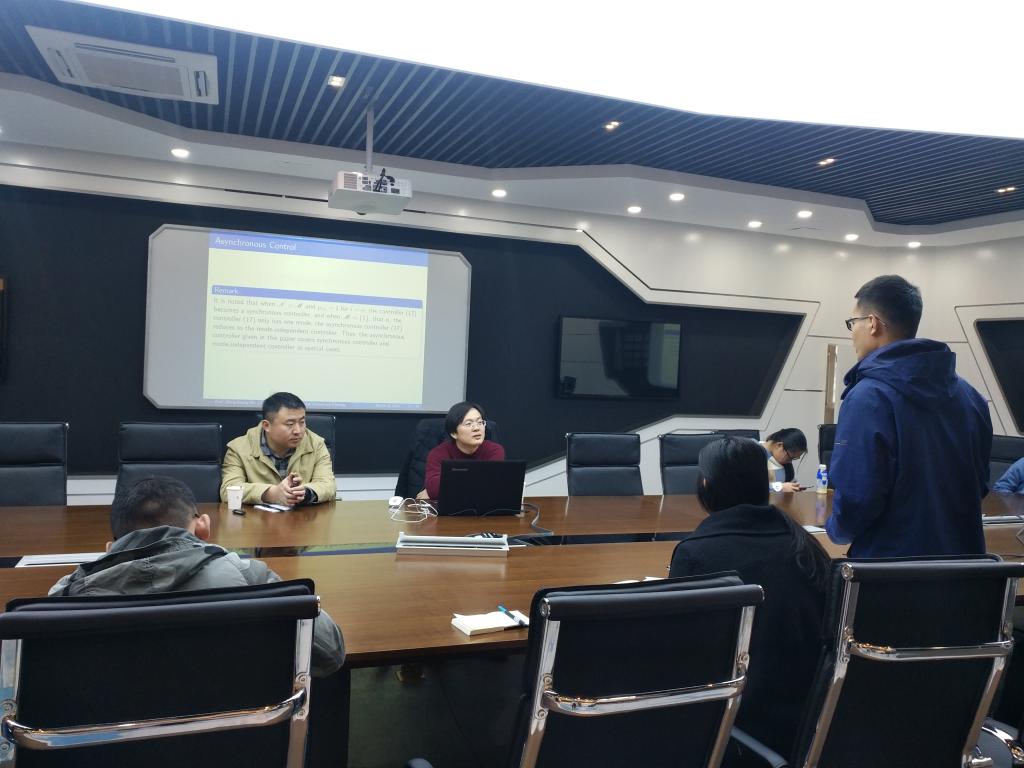 讲座中,吴争光研究员将网络中常见的时滞、丢包、采样与马尔可夫跳变系统相结合,讲述了马尔可夫跳变系统的增益分析。吴争光研究员介绍了Markovian(马尔可夫)跳变系统,从离散系统与连续系统建模角度出发,介绍了正Markovian跳变系统的相关引理及定理,讲解了马尔可夫跳变系统的特例——2D伯努利跳变系统。讲座结束后,参加学术报告的师生踊跃提问,并与吴争光研究员展开了热烈讨论。