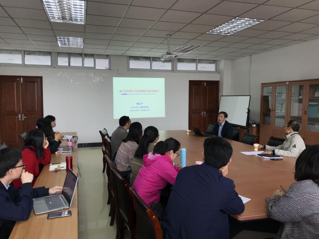 4月28日,应管理科学与工程学院邀请,东北大学工商管理学院副院长樊治平教授,在bat365德济楼507会议室作了题为“基于在线评价/评论的管理决策问题研究”的学术讲座,讲座由管理科学与工程学院副院长黄健教授主持,管理科学与工程学院部分师生聆听了此次讲座。