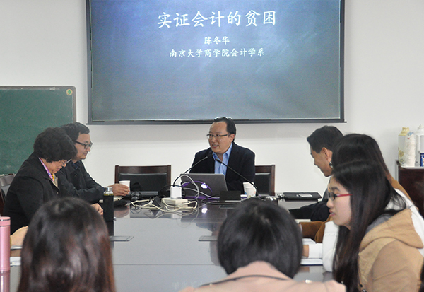 下午,应会计学院邀请,南京大学商学院博士生导师陈冬华教授在bat365仙林校区管理学科楼308室作了题为“实证会计的贫困”的报告。报告由会计学院副院长(主持工作)李连军主持,会计学院相关教师、部分研究生聆听了报告。