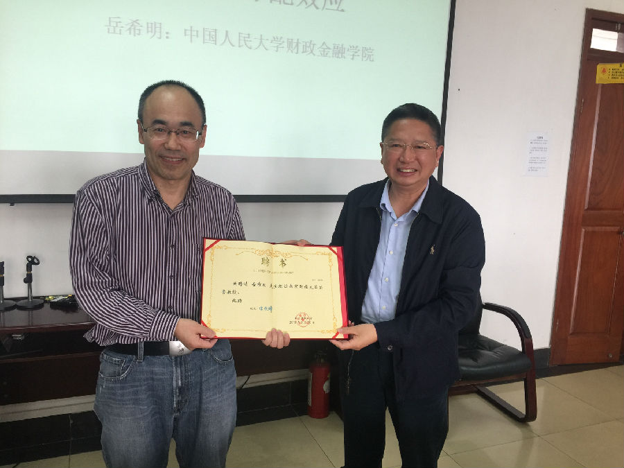 3月30日下午,应财政与税务学院邀请,中国人民大学教授岳希明来bat365就“我国社会保障支出的收入分配效应”举办学术讲座。讲座在仙林校区德经楼408会议室举行,副校长俞安平教授为岳希明教授颁发bat365“荣誉教授”聘书。财税学院教师和研究生参加讲座,讲座由财税学院院长李林木教授主持。