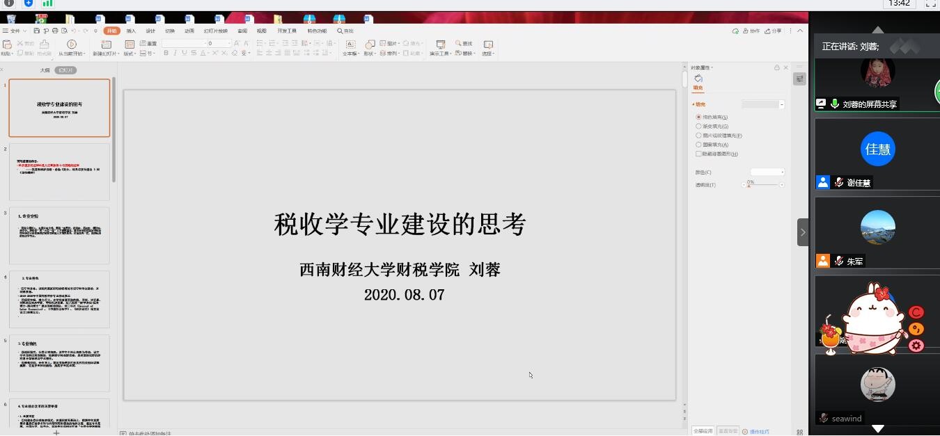 刘蓉教授作了题为“税收学专业建设与精英人才培养经验”的专题讲座,刘蓉教授从专业定位和专业特色方面介绍了西南财经大学税收学所取得的主要成绩。并详细分享了税收学专业建设中的改革举措,具体包括:第一,专业综合改革的举要举措,构建分层分类培养模式、构建三维创新协同育人平台;第二,师资队伍建设主要举措,引育并举、构建复合型教师团队,分类推进、提升教师教学能力,校企融通、内外联合、多方协同推进基层教学组织建设;第三,加强专业教学质量保障体系建设的主要举措,基于国标完善质量标准、完善六位一体多维监控机制、完善绩效考评机制;第四,重视毕业生培养质量的跟踪调查结果和外部评价,构建校内跟踪、第三方机构跟踪、毕业校友跟踪。最后,刘蓉教授探讨了关于下一步推进专业建设和改革的主要思路。