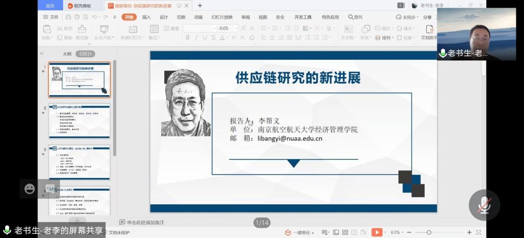 11月10日上午,应营销与物流管理学院邀请,南京航空航天大学经济与管理学院教授李帮义在腾讯会议平台作了题为“供应链研究的新进展”的学术讲座。学院部分教师和研究生聆听了讲座。讲座由营销与物流管理学院副院长(主持工作)陶经辉主持。