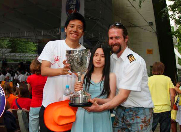 图为徐玉隽(中)手捧航海赛冠军奖杯