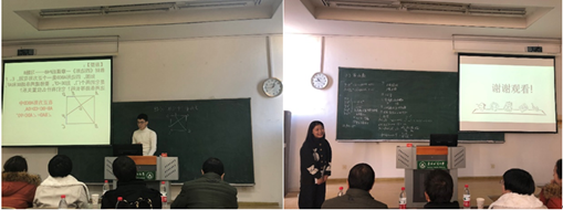 本次比赛分为两个环节,第一个环节是参赛选手展示,在规定的20分钟内完成授课教学,由几位评委现场打分。2016级数学与应用数学专业的五名参赛选手分别以“认识分式”“等腰三角形及其性质”“幂函数”“集合间的基本运算”“正方形之十字架问题”五个课题进行授课展示。每位选手都做了充足的准备,举手投足之间显现出自信和大方,教学语言严谨得当,表达清晰流利。