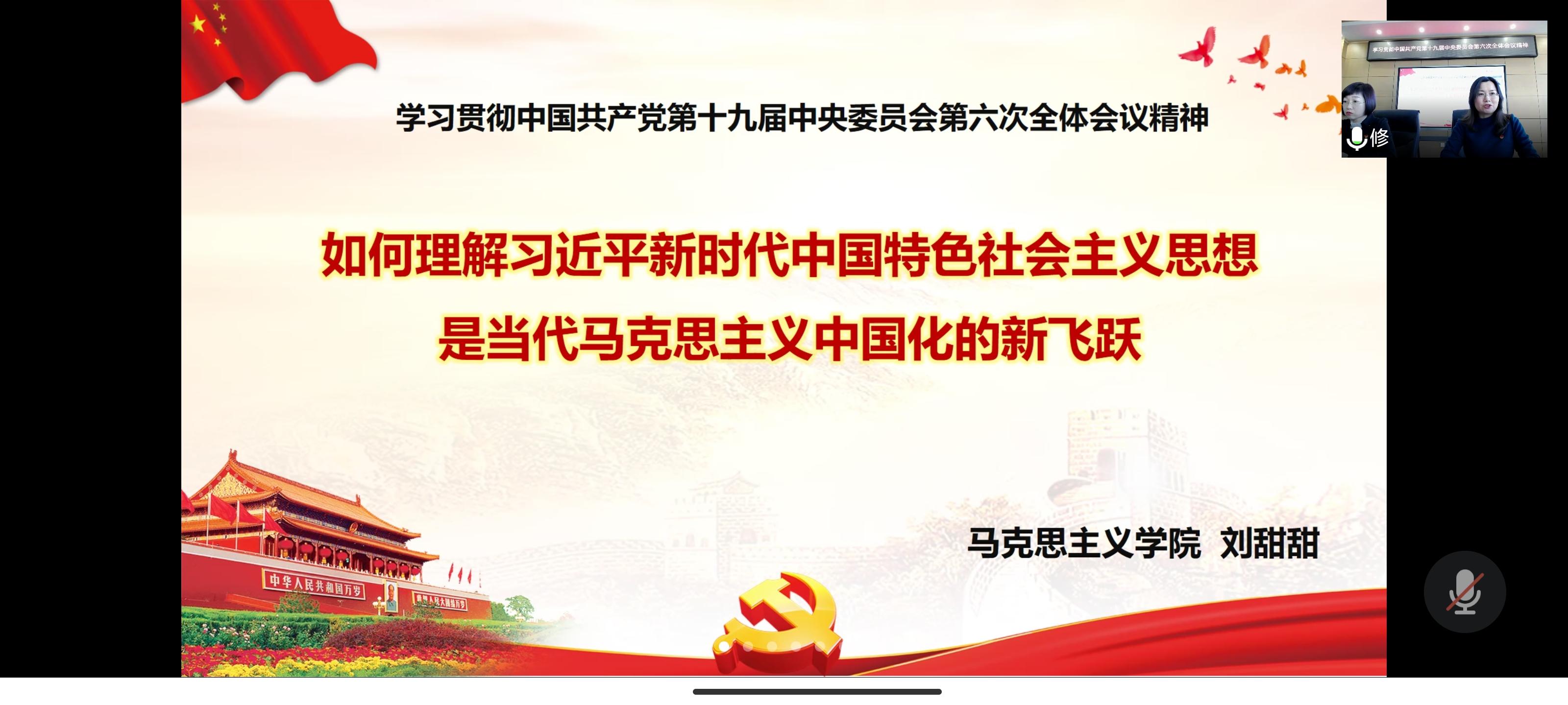 刘甜甜从马克思主义中国化的三次飞跃、如何理解习近平新时代中国特色社会主义思想是马克思主义中国化的新飞跃两方面内容进行讲解,分析了习近平新时代中国特色社会主义思想是当代中国马克思主义、是二十一世纪马克思主义、是中华文化和中国精神的时代精华。刘甜甜老师讲授的内容深入浅出,既具有理论的高度,又便于大家理解,对学习党的十九届六中全会精神具有很强的帮助性。