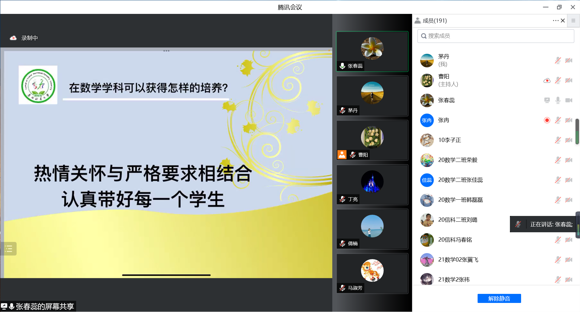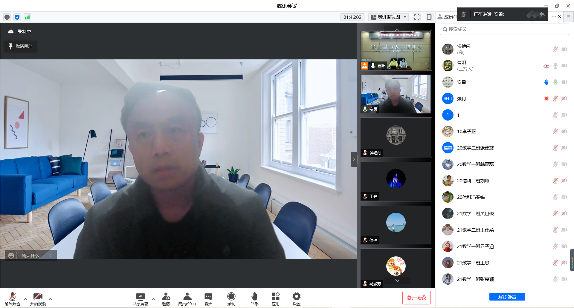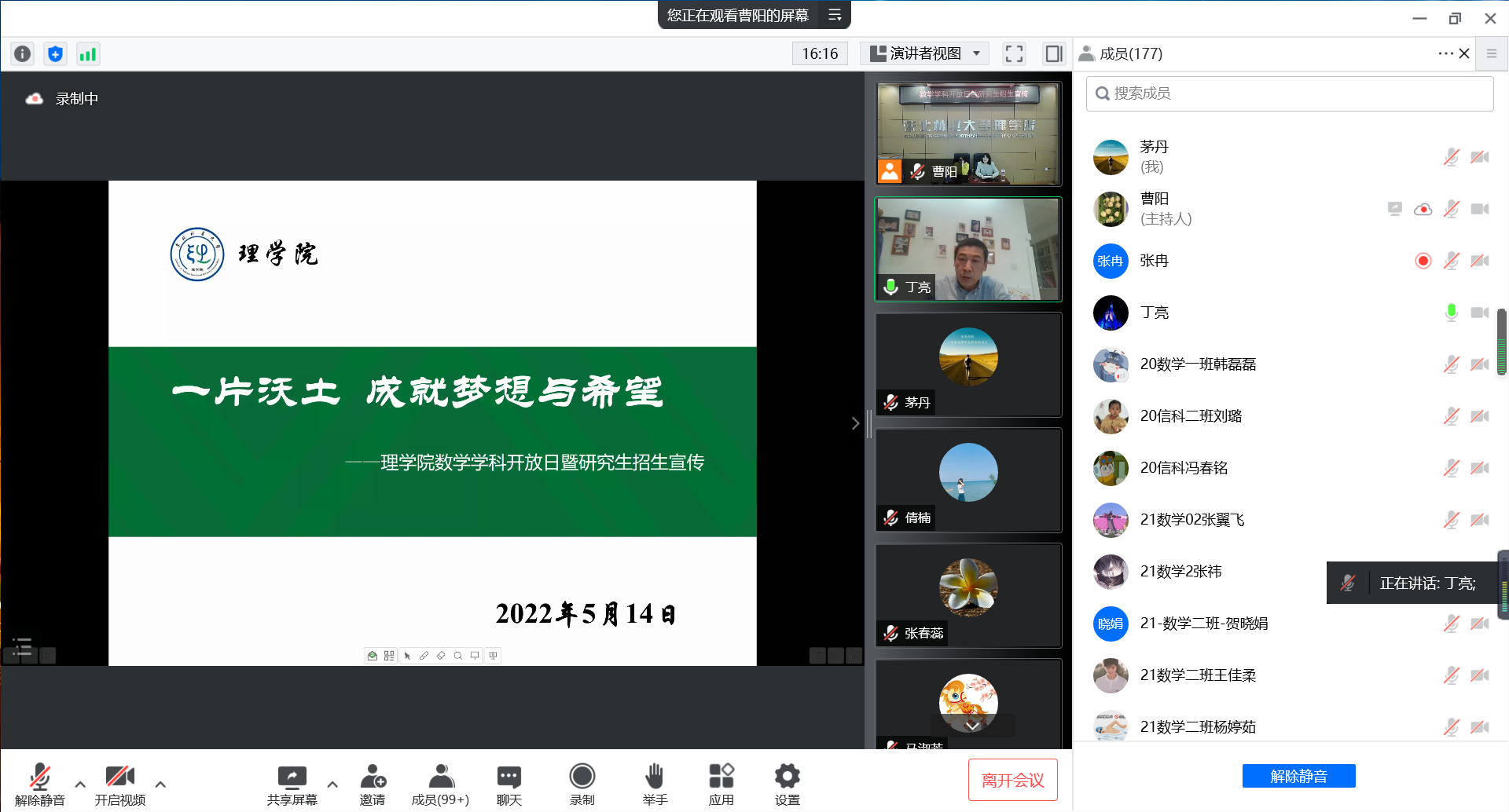 5月14日晚6点,beat365正版唯一官网必一数学学科在“云端”举办了“数学学科开放日暨研究生招生宣传”活动,首次面向家长开放。beat365正版唯一官网必一院长安勇、党委书记李玉荣、副院长丁亮、副书记副院长李鹏、研究生秘书张冉、数学学科导师、数学与应用数学专业本科生、信息与计算科学专业本科生以及部分学生家长参加了本次活动。研究生院副院长兼招生办主任周振宝、硕士研究生招生管理负责人李昆明、硕士研究生招生管理科员赵金迪出席了会议。会议由数学学科秘书曹阳、顾海燕主持。