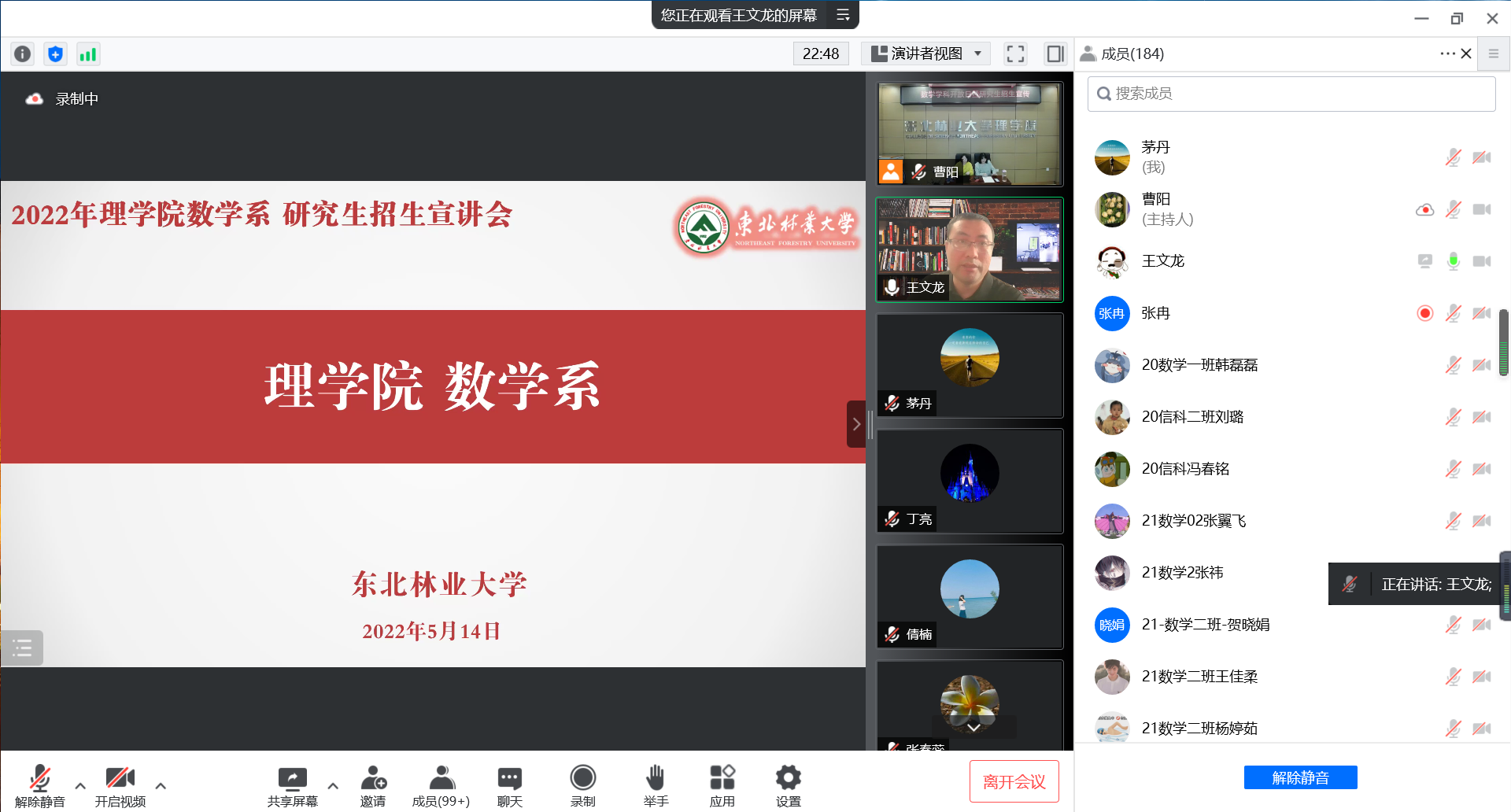 然后,数学学科的优秀研究生毕业代表2020届应用数学学科方向硕士研究生宋倩楠、2020届概率论与数理统计学科方向硕士研究生徐东升、2021届应用数学学科方向硕士研究生曲明珠分别结合自身成长经验分享了他们在读研期间的学习经历和体会,纷纷表示:正是通过学科及导师无私的悉心培养,让他们站上了更高、更广阔的舞台。在读研究生代表2020级应用数学学科方向研究生茅丹和2022年考取本校数学学科研究生复试总分第一名的2018级数学与应用数学专业王子洋分别从学业规划、备战考研等方面向学弟学妹们分享成功经验。