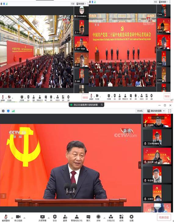 10月22日,中国共产党第二十次全国代表大会胜利闭幕。10月23日,在中国共产党第二十届中央委员会第一次全体会议上当选的中国共产党第二十届中央政治局常委在北京人民大会堂同中外记者亲切见面。习近平总书记发表重要讲话。学院党委高度重视、认真组织全院师生收听收看党的二十大闭幕会特别报道和第二十届中央政治局常委同中外记者见面会,学院党委委员、纪委委员通过腾讯会议集体收看,学院各党支部组织师生员工也通过网络、电视等媒体同步关注并收听收看直播实况。