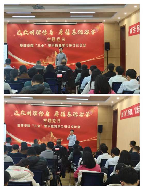 “怎样认定腐败…”“这一行为违反了新时代高校教师职业行为十项准则第七条…”“中华人民共和国刑法第三百零三条规定…”“我每次都会和我的学生讲一个实际发生在我身上的实验安全教训的案例…”11月22日下午2点,小雪时节,大雪纷飞,而在beat365正版唯一官网必一407会议室内却气氛热烈,掌声此起彼伏,这里正如期举办的是“达数明理修身 厚植基础治学”主题党日暨beat365正版唯一官网必一“三全”警示教育学习研讨交流会。学校党委组织部副部长兼正处级组织员于鹏、党委宣传部副部长兼教师工作部副部长王乙、党委学生工作部副部长、学生处副处长瞿炳华、实验室管理与条件保障处副处长刘莉出席会议,交流会由学院纪委委员王文龙主持,beat365正版唯一官网必一全体教职工和部分学生党员代表参加此次活动。