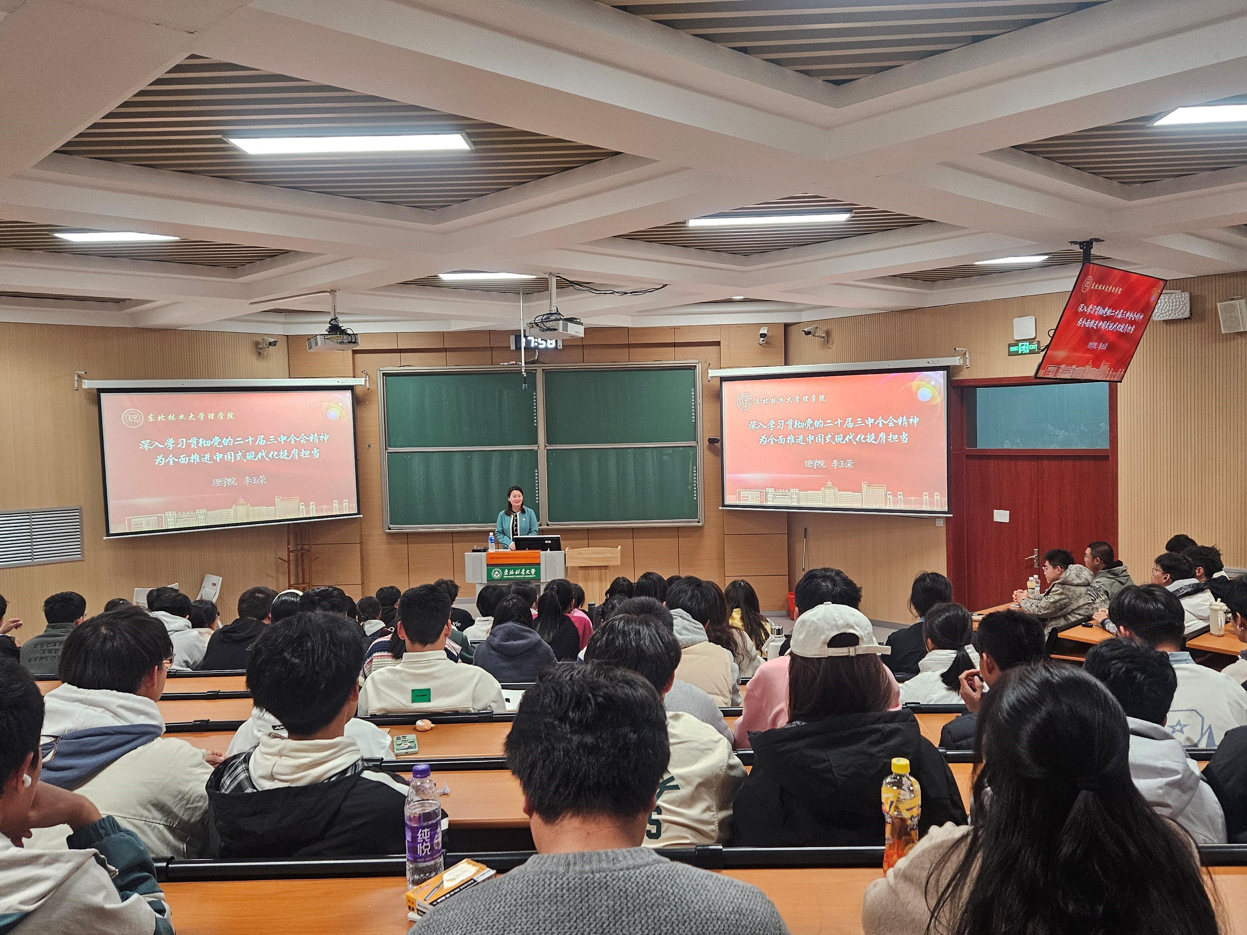 接下来,李玉荣带领大家回顾了党的二十届三中全会概况,并传达黑龙江省委第十三届六次会议的相关精神,号召同学们为教育强省贡献力量。她通过讲解十八届三中全会以来,形成全面深化改革“四梁八柱”总布局,带领大家进一步了解党的二十届三中全会的重要意义。李玉荣指出,全会通过的《中共中央关于进一步全面深化改革、推进中国式现代化的决定》,是新时代新征程上推动全面深化改革向广度和深度进军的总动员、总部署,既是党的十八届三中全会以来全面深化改革的实践续篇,也表明了新征程推进中国式现代化广阔前景的坚强决心,向国内国际释放了我们党坚定不移高举改革开放旗帜的强烈信号,是党的历史上又一纲领性文献。
