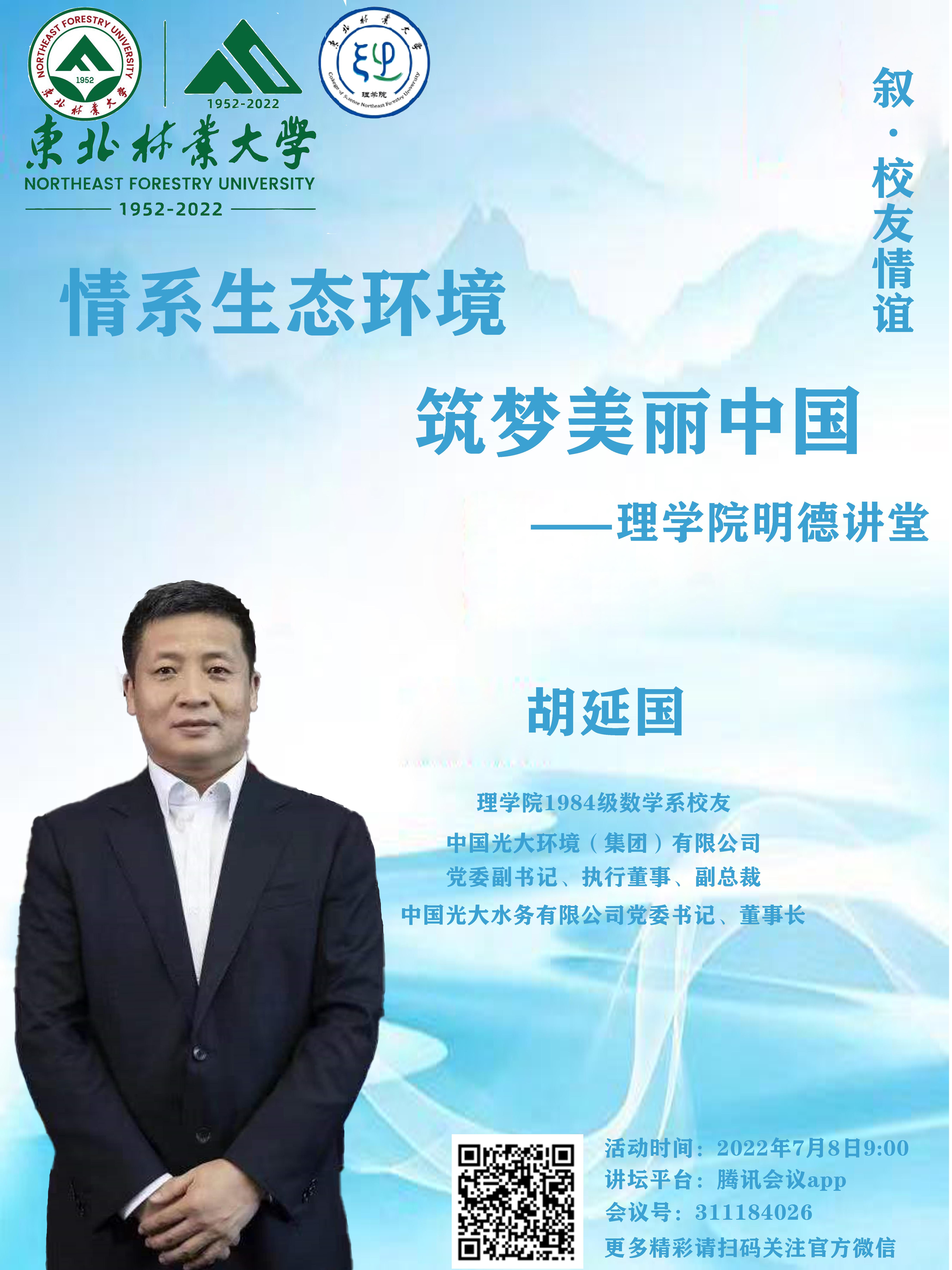 届时,胡延国校友将结合他的工作经历,讲述他的心路历程与成长动力,感悟东林精神,情系生态环境,筑梦美丽中国!