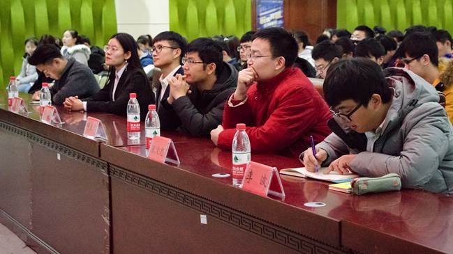 第二部分讲解的内容是面试介绍。首先,老师从面试的意义出发,向大家解释了面试的内涵。老师分别通过具体事例向大家明确说明在面试时要注意的禁忌、如何面对设置的紧急突发情况等问题。然后严老师通过与同学们的现场模拟面试情节生动的阐述了如何表达与展示自己。现场气氛活跃,同学们积极地向老师提出问题,老师一一耐心回答。讲解结束后,老师再次挑选三位同学的问题进行解答,这三位同学也得到了相应的奖品。