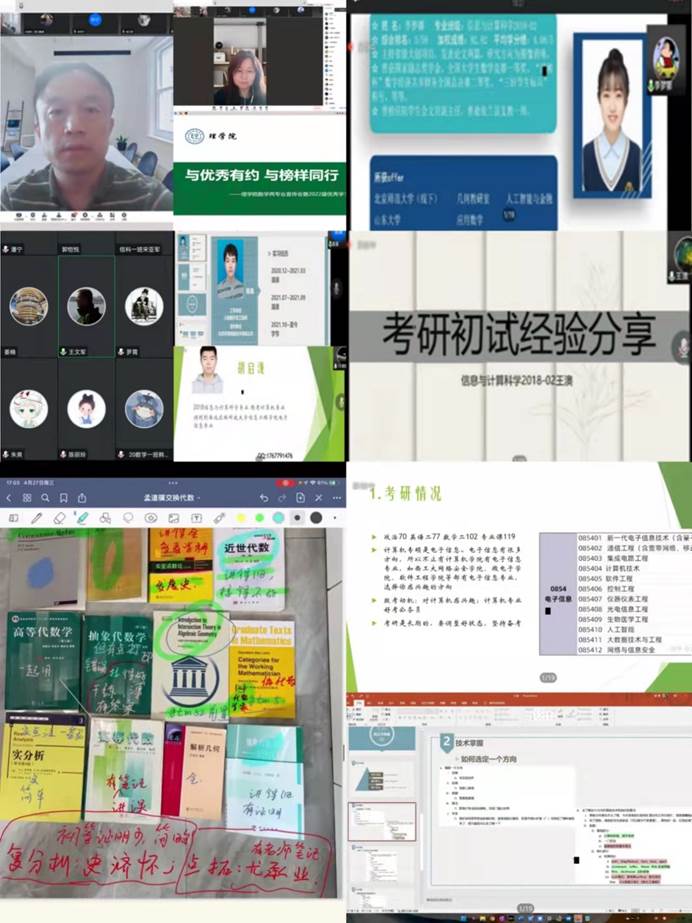 本次活动由数学教工第二党支部双带头人党支部书记、信息与计算科学专业负责人、院关工委委员马晓剑主持。会议邀请了beat365正版唯一官网必一2018级数学与应用数学、信息与计算科学专业的7名优秀学子向2020级和2019级数学系的学生做了经验分享,共计135名学生参与了此次活动。这七位同学中不乏有研究生初试以418分被大连理工大学入取的、有复试逆袭成功考取西安交通大学的、有不轻言放弃调剂到985高校的、有刻苦努力保送到哈尔滨工业大学的、有具备超强自学能力被大厂高薪录用的……他们就保研的政策解读、夏令营的准备;考研复习的时间规划、复习资料的推荐;就业方向的确立、自学课程的获取等方面做了全面、细致、详尽的分享。内容几乎涵盖了保研、考研、就业中学生关注的所有问题。此外,数学与应用数学专业负责人徐金利老师还就两个专业的人才培养状况和未来就业走向作了介绍和宣传。宣讲会针对性强,内容丰富,受到同学们的热烈欢迎和积极反馈。