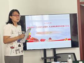 潘宁首先从党代会的主题、高频词、热词等角度入手,回顾了报告中提到的龙江未来五年振兴发展的发展方向,聚焦“六个龙江”、“八个振兴”、“九个坚定不移”等重要内容。接着潘宁结合自身的实际工作岗位,从发展、科技、环境、人才等方面对报告内容进行了解读。指出支部党员应该通过自身基础理论研究水平的提升,为本省的科技发展贡献力量。最后潘宁希望全体党员深刻理解把握会议精神,学深悟透会议精神实质和核心要义,找准省党代会对龙江高校和科技人才的新要求新期待,有针对性地做好衔接落地工作。积极发挥党员群体示范作用,用科技创新合力为龙江产业经济发展赋能。